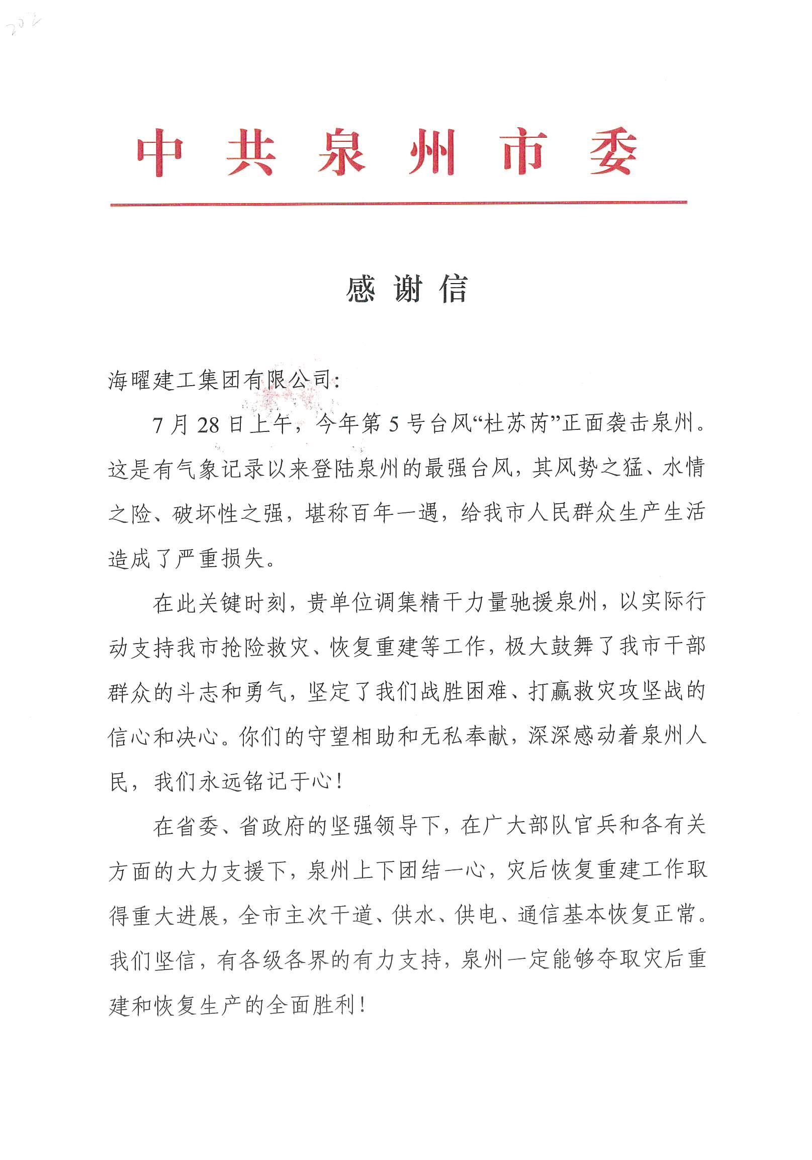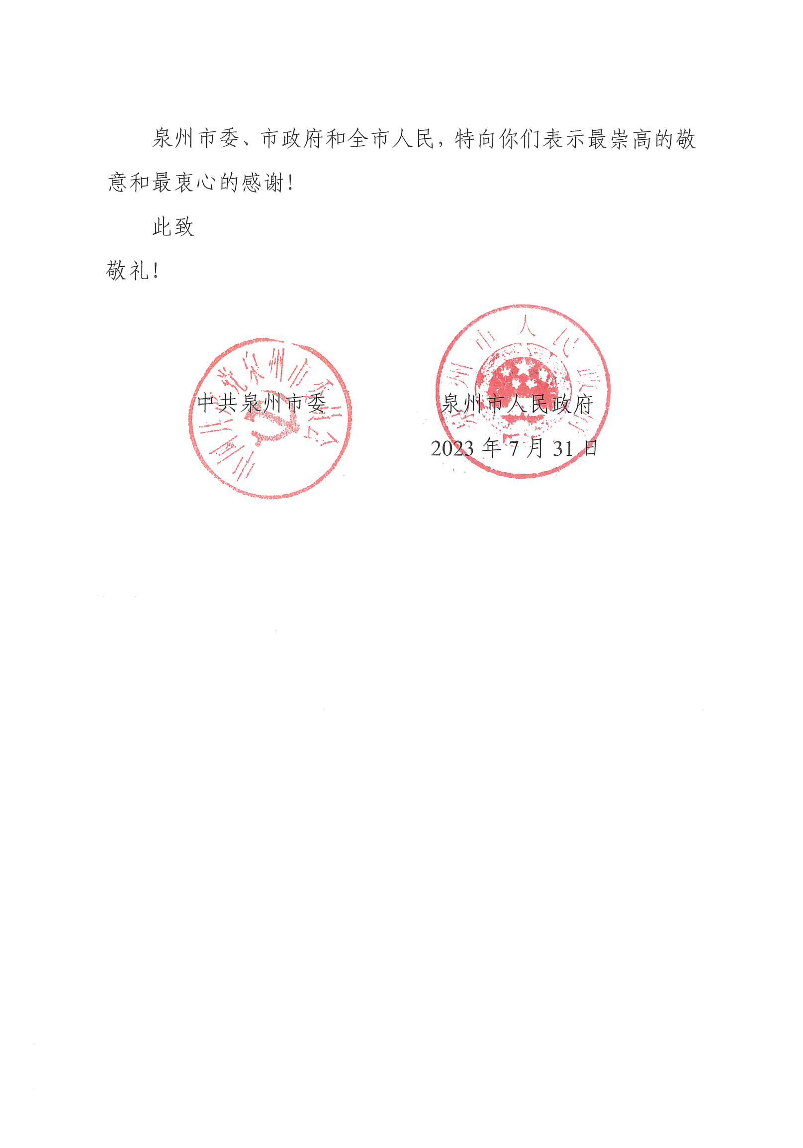 来自中共泉州市委感谢信